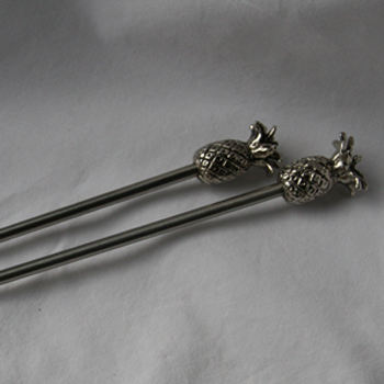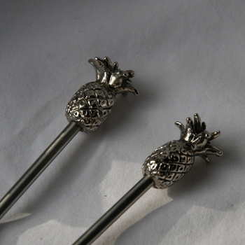 A set of two silver pineapple cocktail stirrers.