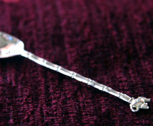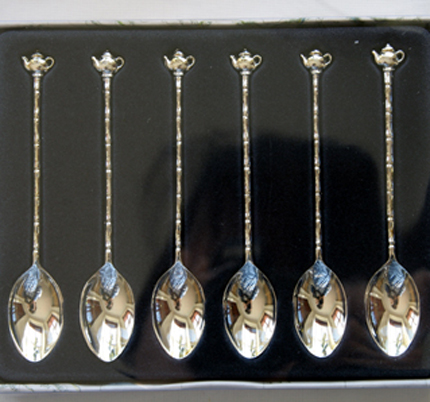 Beautiful silver-plated teaspoons with teapot handles presented in a box of 6 on a dark blue velvet bed. A lovely gift for the tea lover in your life.