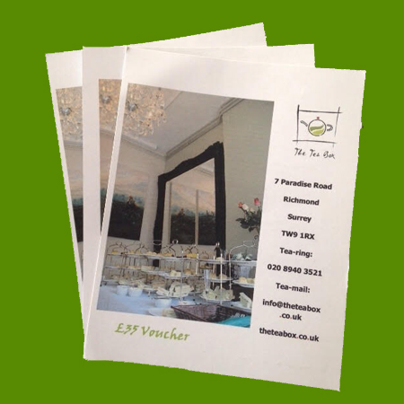 Tea Box gift vouchers are available in £15, £25 or £35 to spend in store or online. You can use them to purchase goods or for an afternoon tea experience in our lovely tea room situated in the historic Richmond-upon-Thames (you will need to ring the booking line on 020 89403521).