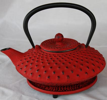 A modern Shimizu Japanese iron teapot made in a traditional Japenese design complete with iron trivet to protect your table.